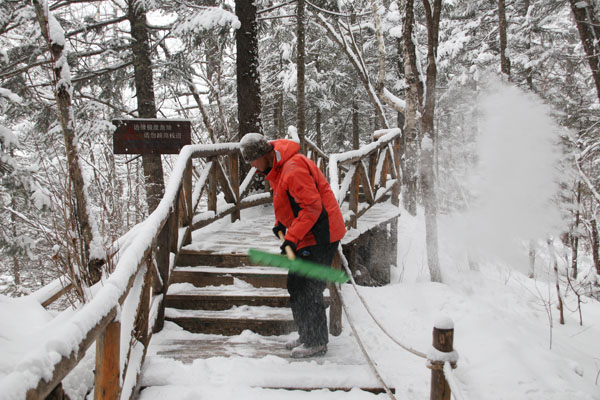 大年初一,長白山普降瑞雪,公路積雪厚度近50厘米,服務(wù)先鋒黨小組以雪為令,小組中以黨員為骨干的清雪防滑隊,凌晨就頂著星辰和寒風開始清雪除障作業(yè),保證道路在山門開放前安全暢通達到開放要求,大家克服凜冽的寒風完成1800米棧道積雪清理工作。