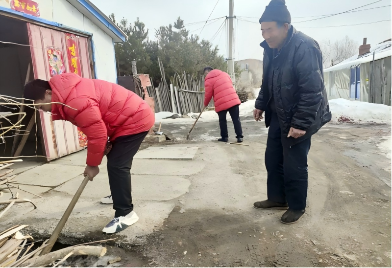 當(dāng)?shù)竭_(dá)老黨員家中,此時老人正坐在房前劈柴,看到隊員們的到來熱情地招呼大家。隊員們有的主動從老人手上接過斧子劈起柴,并將劈好的柴火擺放整齊;有的拿起掃帚把院子掃得干干凈凈;有的找來長把斧子和鐵鍬在門前鑿開一條排水溝方便積水排水??粗麧嵉脑郝洹惩ǖ乃疁?/span>和老人的笑容,隊員們勞動的成就感油然而生。